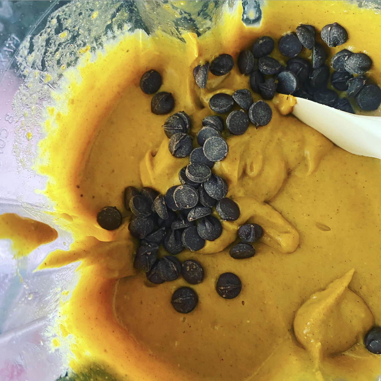Pre-heat oven to 315. In a VitaMix or high powered blender, blend together squash, tofu, almond butter, maple syrup, vanilla, nutmeg, pumpkin pie spice, cinnamon, stevia, pink salt, pepper until smooth–you may need the plunger to move all ingredients evenly into blade until all is silky smooth. Sprinkle some chocolate chips into blender after blending (not to chop chips up) and stir with spatula. Poor pumpkin batter into pie pan or cupcake tins and sprinkle top with some more chocolate chips before baking in oven for 45min. Cool for 15min before serving.